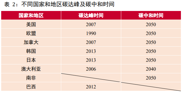 美国实现碳达峰的时间是2007年,实现碳中和的时间为2050年,欧盟实现碳达峰的时间为1990年,实现碳中和的时间为2050年,加拿大实现碳达峰的时间为2007年,实现碳中和的时间为2050年,韩国实现碳达峰的时间为2013年,实现碳中和的时间为2050年。日本、澳大利亚实现碳达峰和碳中和的时间分别为2013年和2050年、2006年和2040年,此外的南非实现碳中和的时间是2050年,巴西实现碳达峰的时间为2012年。除此之外,我国计划在2030年实现碳达峰,约比欧盟实现碳达峰晚约40年,比美国晚约23年,比日韩晚约17年,之后,我国计划在2060年实现碳中和,仅比发达经济体实现碳中和晚约10年。